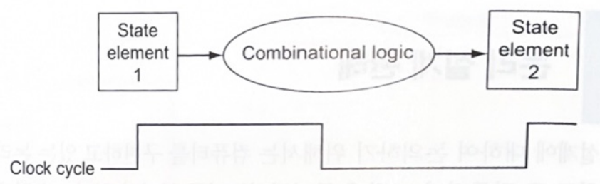 상태 소자만이 데이터 값을 저장할 수 있끼 때문에 모든 조합 논리는 상태 소자에서 입력을 받고 상태 소자로 출력을 내보낸다.조합 논리의 입력은 이전 클럭 사이클에서 상태 소자에 쓴 값이고, 출력은 다음 클럭 사이클에서 조합 논리나 상태 소자가 사용할 수 있는 값이다.
