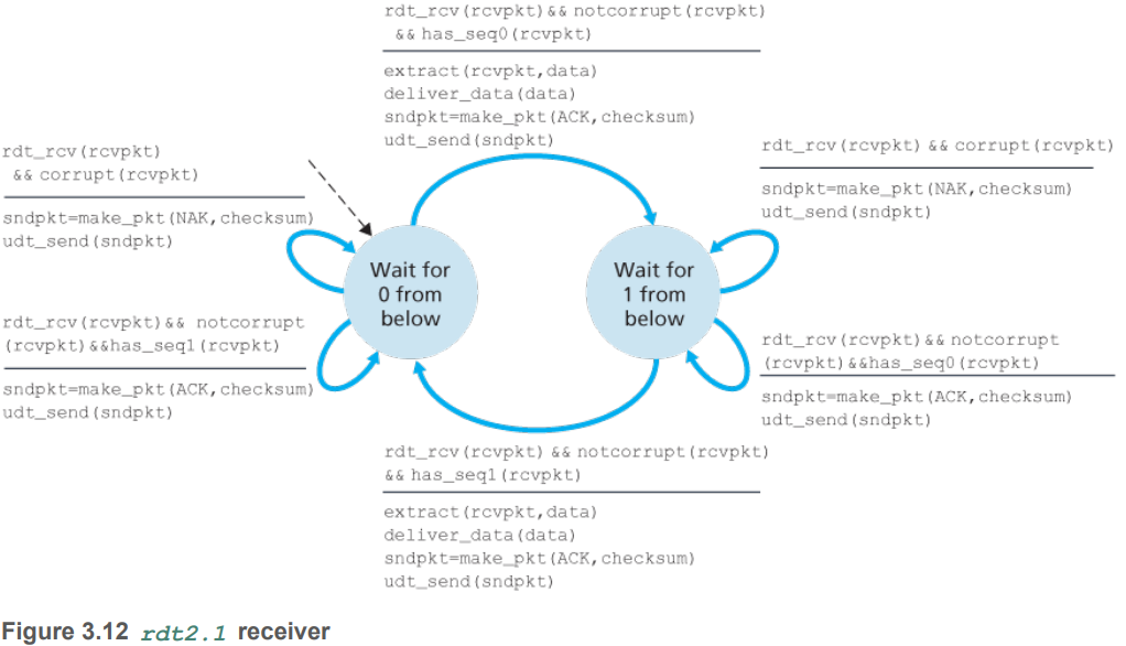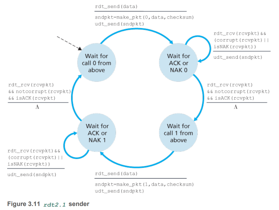rdt2.1과 rdt2.2의 차이는 rdt2.2는 ACK만을 응답한다는 것이다. 수신자는 응답 ACK를 보낼 때 어떤 순서 번호에 대한 ACK인지를 같이 보내서 송신자에게 수신자가 올바르게 수신했는지를 알게 한다.
