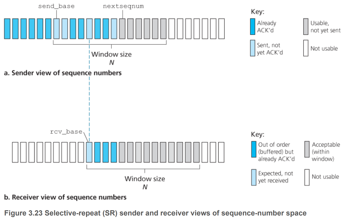 GBN과 마찬가지로 SR에서도 window size N은 파이프라인에서 아직 확인응답이 안 된 패킷 수를 제한하는 데 사용된다. 하지만 GBN과 달리 SR은 윈도(window)안에 ACK를 받은 패킷이 있을 수 있다.