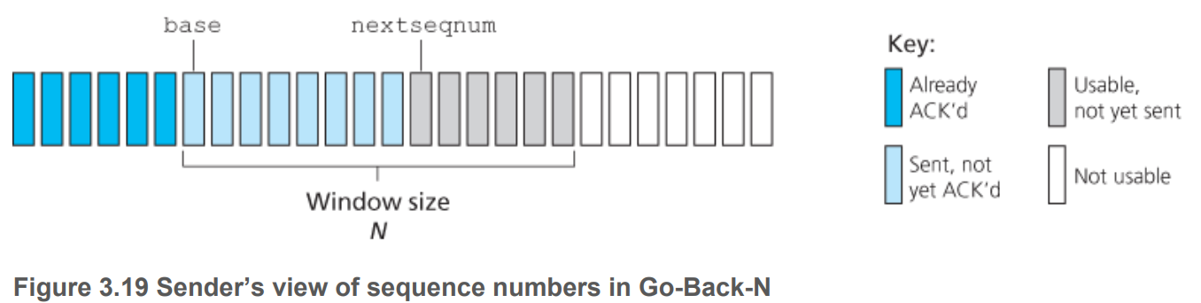 확인 응답이 되지 안 된 패킷의 최대 허용 수는 N개이다. 이 N을 윈도 크기(window size)라고 하고, 이 윈도(window)는 오른쪽으로 이동(slide)된다. 그래서 GBN 프로토콜은 슬라이딩 윈도 프로토콜(sliding-sindow protocol)이라고 부른다. (이를 N으로 제한하는 이유는 이후 3.5절과 3.7절에서 배운다.)