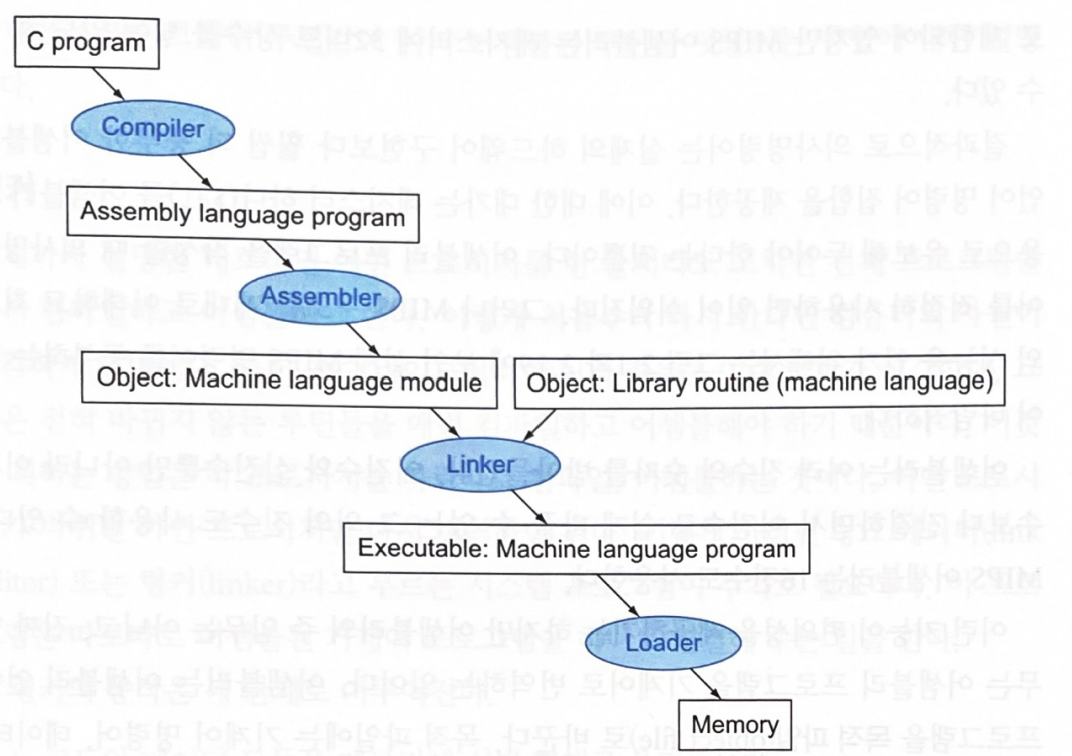 컴파일러는 C 프로그램을 어셈블리 언어 프로그램으로 바꾼다. 과거 운영체제와 어셈블러는 어셈블리 언어(assembly language)로 작성했지만, 오늘날에는 DRAM의 용량이 훨씬 커졌고 컴파일러가 최적화 되면서 그런 경우가 거의 없다.
